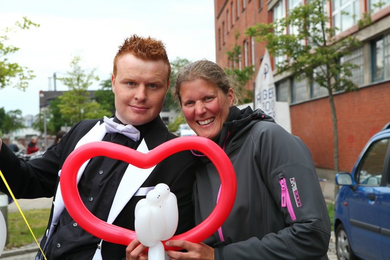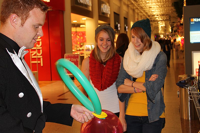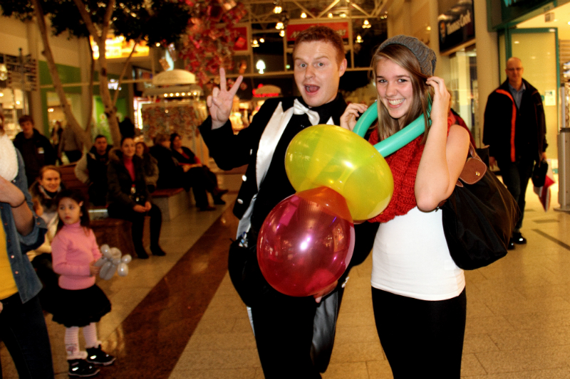 Hier werden Luftballonskulpturen gedreht, gequetscht und geknotet. Wenn sie fertig sind, werden sie ans Publikum verschenkt.